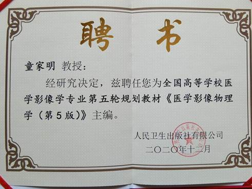 2021年3月22日,全国高等学校医学影像学专业第五轮规划教材主编人会议在天津召开。我院童家明教授被聘任为全国高等学校医学影像学专业第五轮规划教材《医学影像物理学(第5版)》主编。据悉,全国高等学校医学影像学专业第五轮规划教材拟定于2022年5月出版发行,供全国院校教学选用。