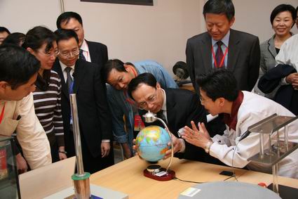 10月23日下午,教育部评估专家组在夏临华校长的陪同下,认真考察了物理实验教学中心。在听取了实验教学中心的工作汇报后,专家组一行考察了实验室,并同正在做实验的同学进行了交流。图为评估专家组饶有兴趣的考察演示实验室--专家亲手做磁悬浮演示实验。