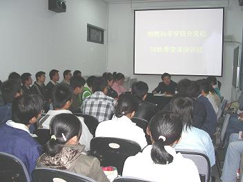 tyc5997太阳集团分党校06秋季培训班日前结业。共有40名入党积极分子和1名06级新生党员参加了本次培训班。他们认真学习了《中国共产党章程》、党史以及组织培养发展程序和入党的基本条件等内容,为今后他们参加大学党校、锻炼提高自己、积极加入党组织奠定了良好的基础。图为物理学院德育导师设备处副处长杨立华同志正在培训班授课。