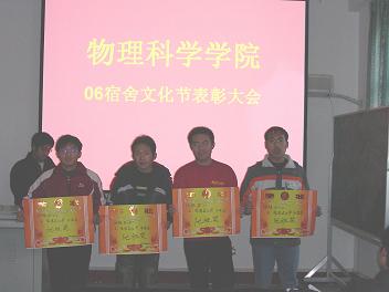 物理学院团总支、学生会组织的为期一个月的我院大学生06冬季宿舍文化节日前结束。通过建设宿舍文化,推动了我院大学生文明修身活动的开展,展现了我院大学生的精神风貌。