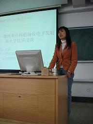 赵清是我院1997级应用物理学专业学生,2001年考入北京大学凝聚态物理专业硕士研究生,并直读博士研究生。现在美国Univ. Washington 从事博士后研究。赵清同学师从俞大鹏教授,从事“准一维宽禁带半导体纳米结构的制备及物理性质测量”的研究,已在国际性的学术刊物上发表数篇高质量的学术论文,曾获得过“北大研究生学术十杰”的荣誉。图为赵清在北京大学物理学院“萃英”研究生学术沙龙第一期上做主讲人。
