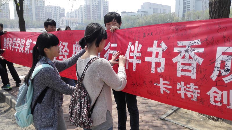 为迎世界读书日,由tyc5997太阳集团举办的“与经典同行,伴书香成长”世界读书日签名活动于23日上午在东校区剑湖旁举行。此次活动吸引不少同学的驻足,大家纷纷拿起笔签下自己在读书日的承诺。 本次活动还包括线上的“学霸荐书”、“学者荐书”好书推荐活动,最后“读书交流会”将总结读书活动,这一系列活动旨在引起了大家对世界读书日的注意,也提醒同学们拿起书本。据第十二次全国国民阅读调查,2014年我国成年国民人均读书不到5本。远低于韩国的11本、法国的20本,以及日本的40本。人们普遍未对读书引起足够的重视,而微博,微信等新媒体却占据我们大部分的闲暇时间。如何提高民众的阅读兴趣,重塑我们的阅读信心,值得我们认真思考。在这第二十个世界读书日,tyc5997太阳集团向同学们发出读书倡议,号召大家静下心来多读书,读好书。