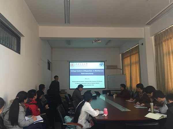 刘明教授在报告中介绍了其课题组近年来在电场调控磁性方面的研究工作。刘明教授课题组通过磁电异质结FM/PZN-PT中电场诱导铁电极化的弹性反转,实现与其耦合的磁化强度的非易失性调控,为实现基于多铁的非易失性磁性存储器件及高频微波器件提供了一种解决方案。刘明教授通过简练的语言带给了师生一场专业的学术演讲,使参加学术交流的师生学习和了解了该研究领域,并开拓了研究思路。