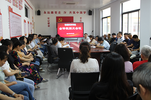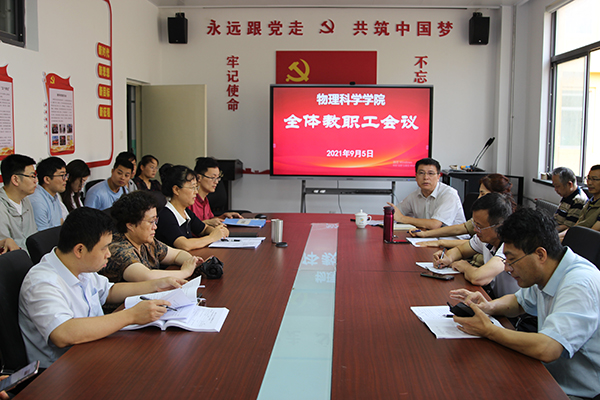 李升学首先传达了学校党委全委(扩大)会议暨2021年暑期中层干部学习研讨班有关精神,并结合学习体会从统一思想、凝聚共识,党建引领、汇聚力量,聚焦发展、争创一流,关注成长、锻造团队,根植文化、共建家园等五个方面详细解读了校党委书记胡金焱作的《统一思想,凝心聚力,科学谋划“十四五”发展》主旨报告以及校长夏东伟的总结讲话,希望各位老师认真学习领会会议精神并贯彻到教学科研等各项工作中去。随后,李升学结合当前工作提出四点要求:一是要继续抓好疫情防控工作,务必实现全体教职工疫苗接种“应接尽接”;二是要继续抓好党史学习教育和习近平总书记在庆祝中国共产党成立100周年大会上的重要讲话精神的学习,切实做好“立德树人”工作;三是要做好开学教学组织安排,保证各项工作井然有序;四是要做好安全稳定和迎新工作,营造温暖和谐的良好氛围。李升学强调,各位老师要围绕学院“十四五”发展目标,凝心聚力,扎实做好各项工作,为学院实现“十四五”高质量发展、学校 “双一流”突破和综合性研究型大学目标实现做出自己的贡献。