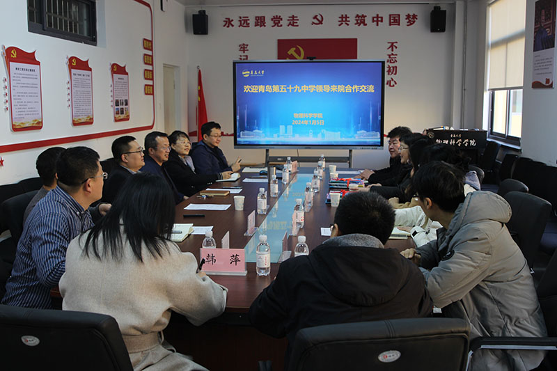 1月5日下午,青岛第59中学校长吴秀伟,青岛市市南区教育和体育局教育科主任陈锦,青岛第59中学副校长郑旭先、教务处副主任李双法、物理教研组长宋风娟等来访我院,tyc5997太阳集团教务处副处长、师范教育办公室主任李传军、学院党委书记郝伟和院长滕冰出席调研会,会议由郝伟主持。