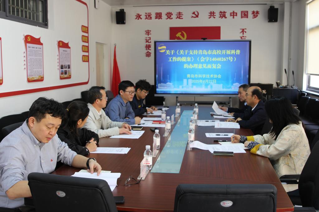 4月27日下午,青岛市科协副主席秦云鹏、科普部部长解玲、调研员任学宝一行莅临我院,针对青岛市政协委员李强院长提交的《关于支持青岛市高校开展科普工作的提案》进行面复。学校科技处处长隋坤艳、综合办主任宋媛媛,我院党委书记郝伟、院长李强,以及钟石磊、孙士家等教师参会。