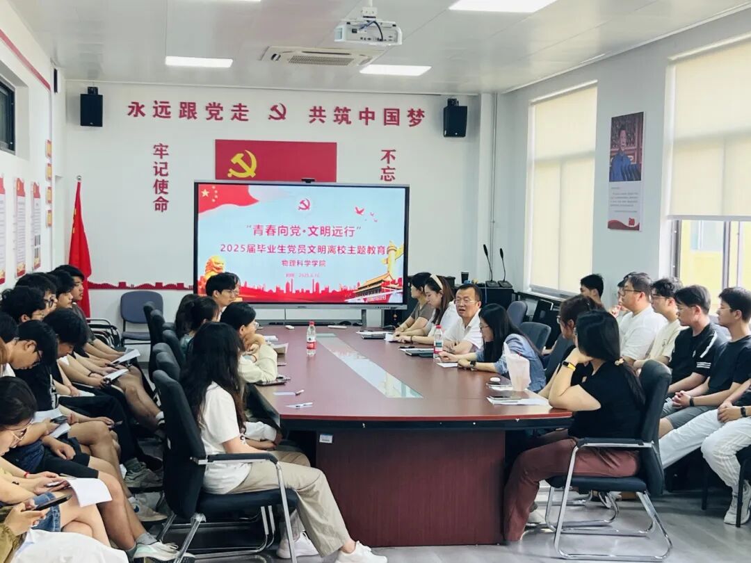为切实做好毕业生党员离校前工作,坚定毕业生党员理想信念,充分发挥党员先锋模范作用,tyc5997太阳集团于6月16日组织开展“青春向党,文明远行”2025届毕业生党员文明离校主题教育活动。此次会议由tyc5997太阳集团学生第一党支部书记杜彦臻主持,学院党委书记郝伟、党委副书记董永红、学生第二党支部书记赵珊及全体毕业生党员参加此次活动。