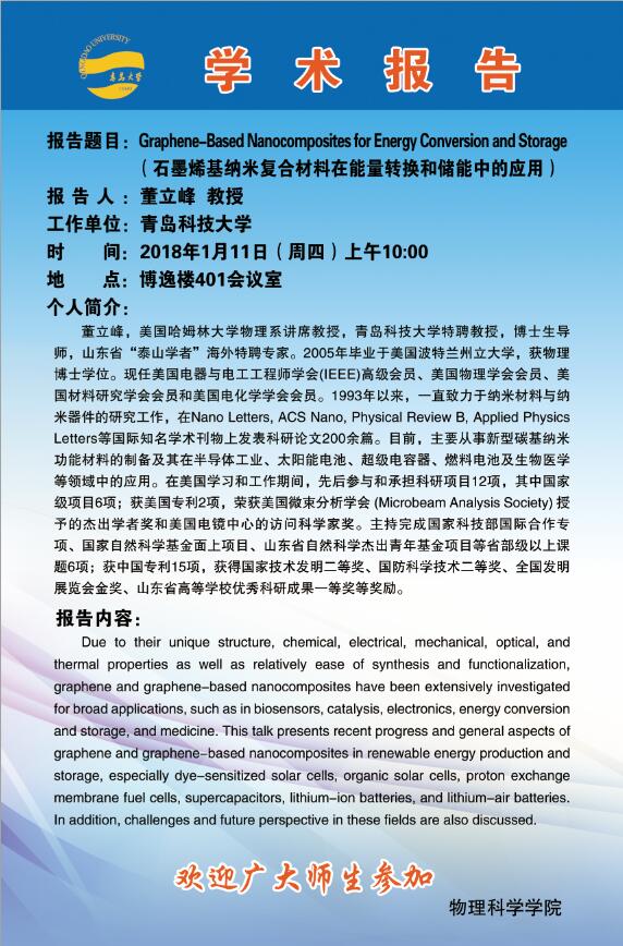 2018物理前沿学术报告第二讲:Graphene-Based Nanocomposites for Energy Conversion and Storage