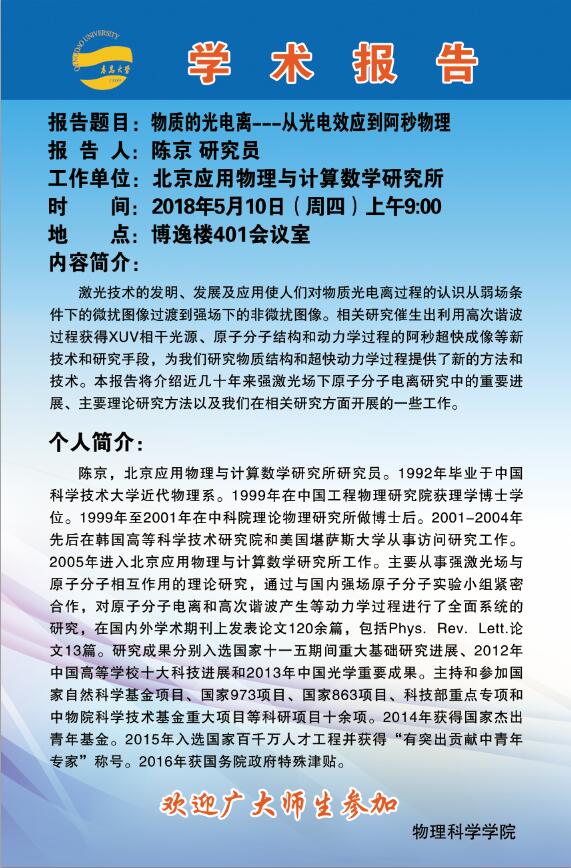上一篇:2018物理前沿学术报告第十四讲:强激光与等离子体结构靶相互作用