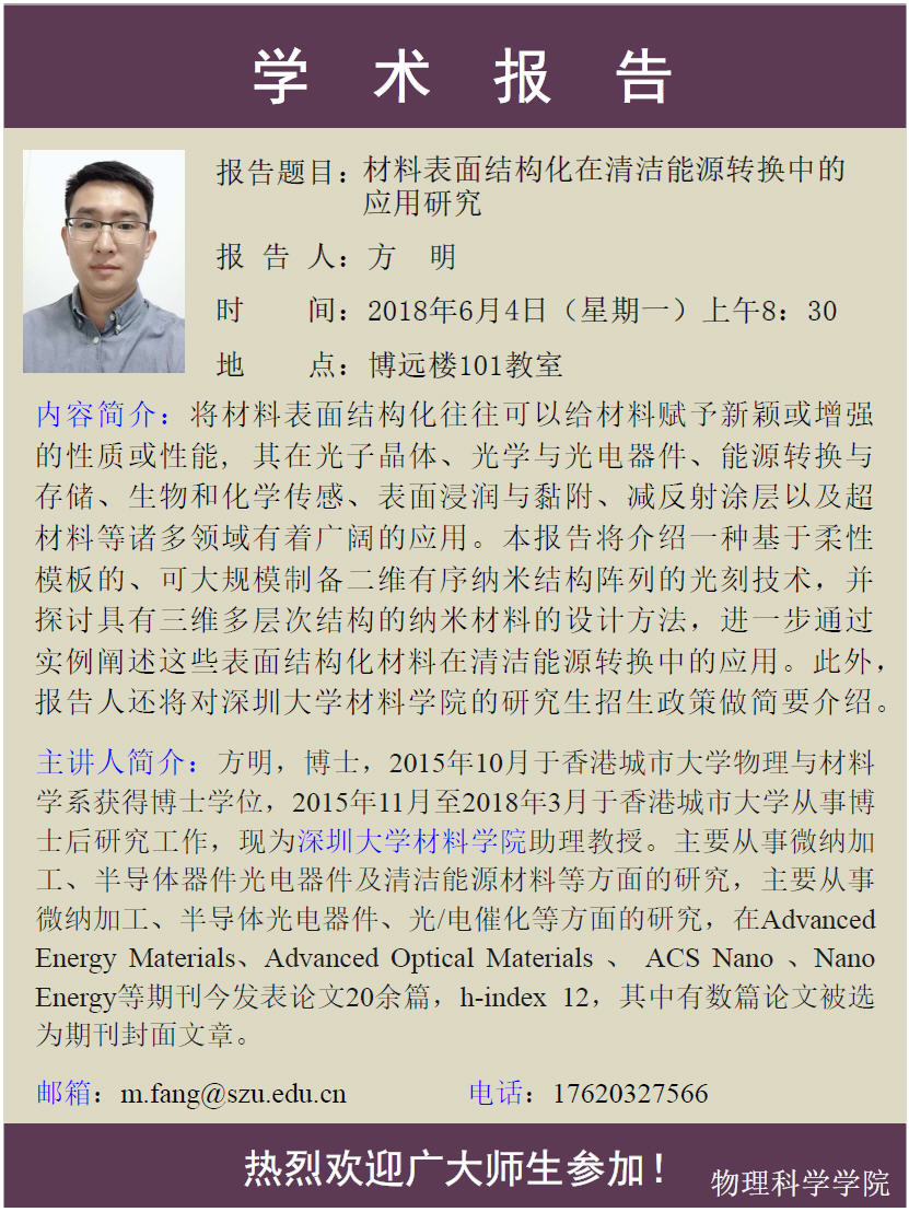 2018物理前沿学术报告第十八讲:材料表面结构化在清洁能源转换中的应用研究