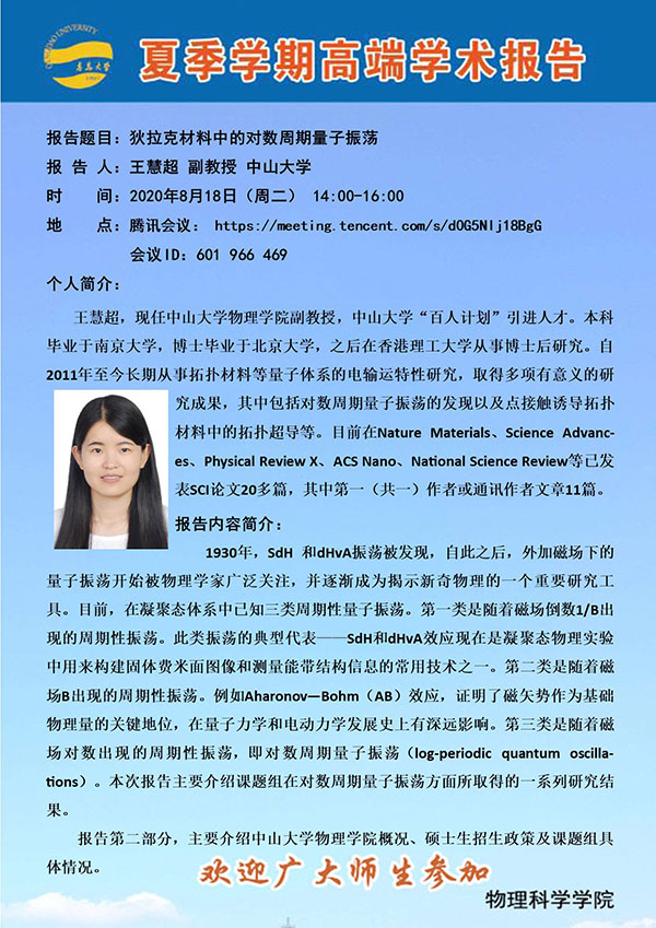 夏季学期高端学术报告:狄拉克材料中的对数周期量子振荡