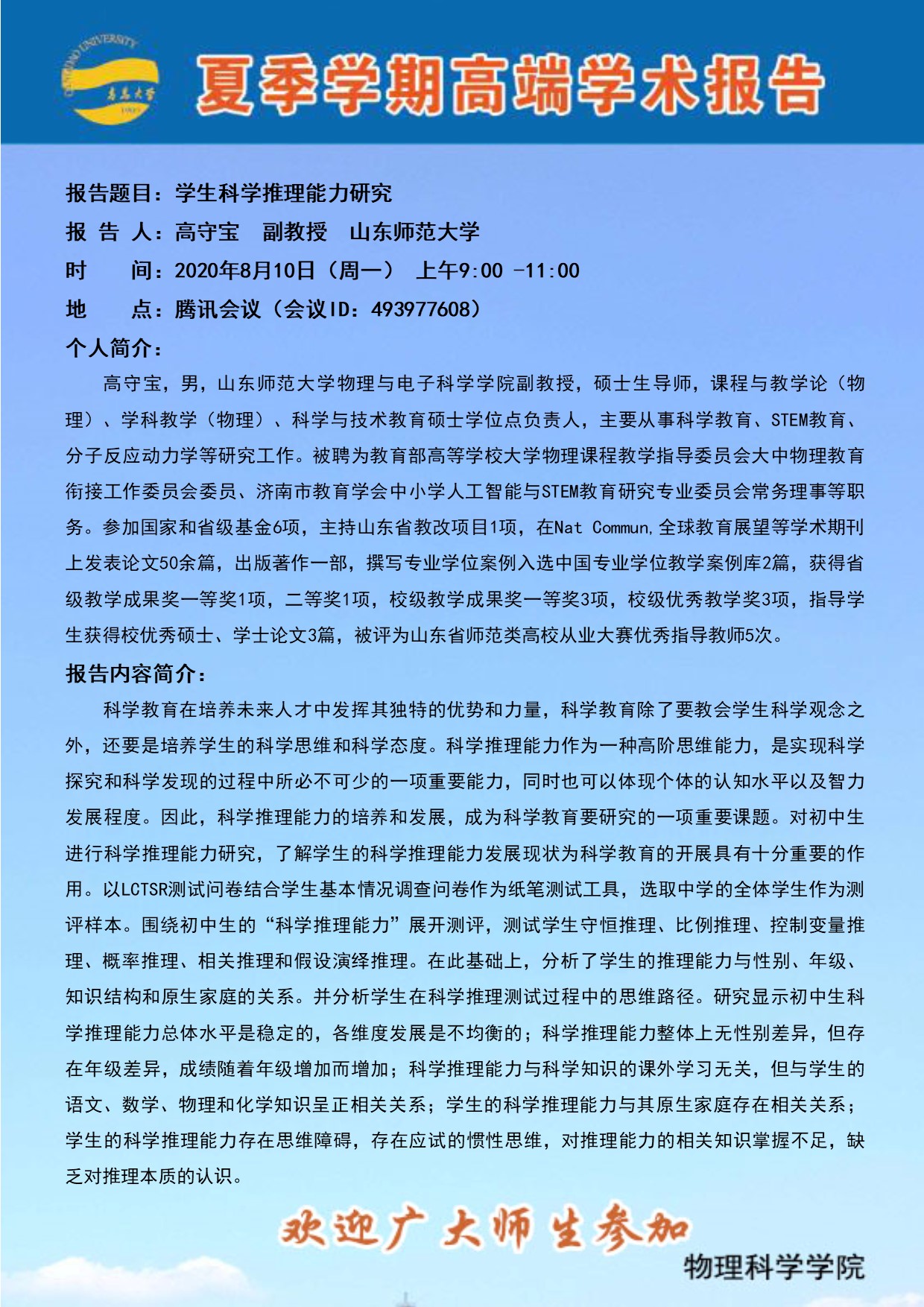 夏季学期高端学术报告:学生科学推理能力研究