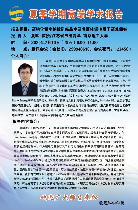 夏季学期高端学术报告:高钠含量水钠锰矿结晶水及多面体调控用于高效储钠