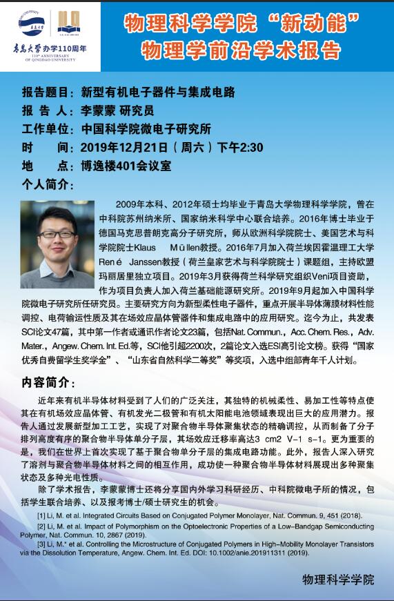 “新动能”物理学前沿学术报告29:新型有机电子器件与集成电路