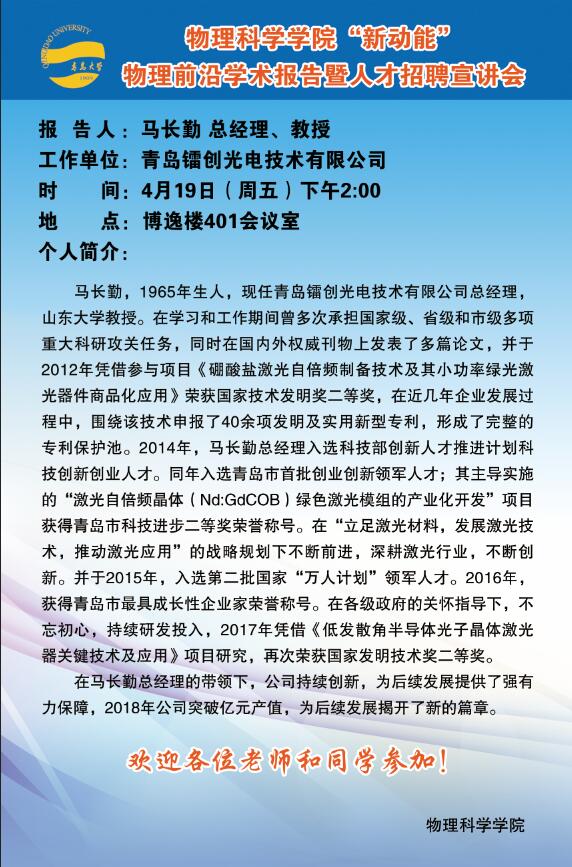 “新动能”物理学前沿学术报告暨考研宣讲1:545 nm 激光器的应用-自倍频激光晶体机遇与挑战