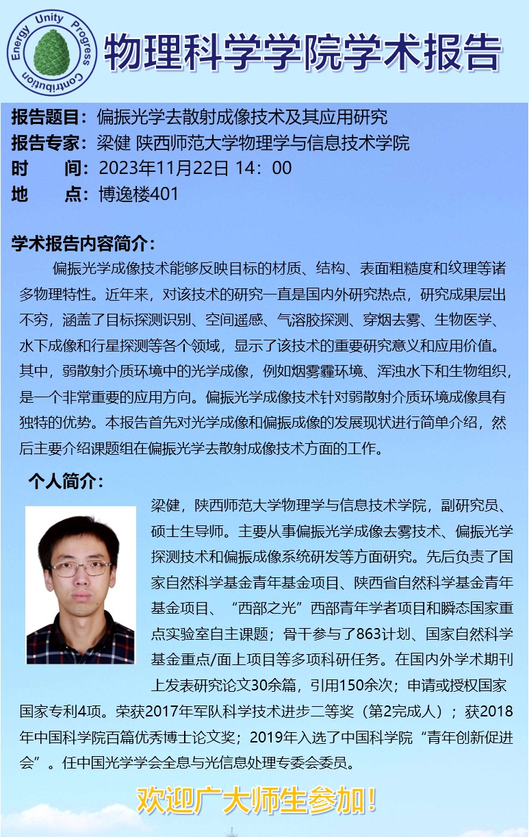 [学术预告]梁健-偏振光学去散射成像技术及其应用研究
