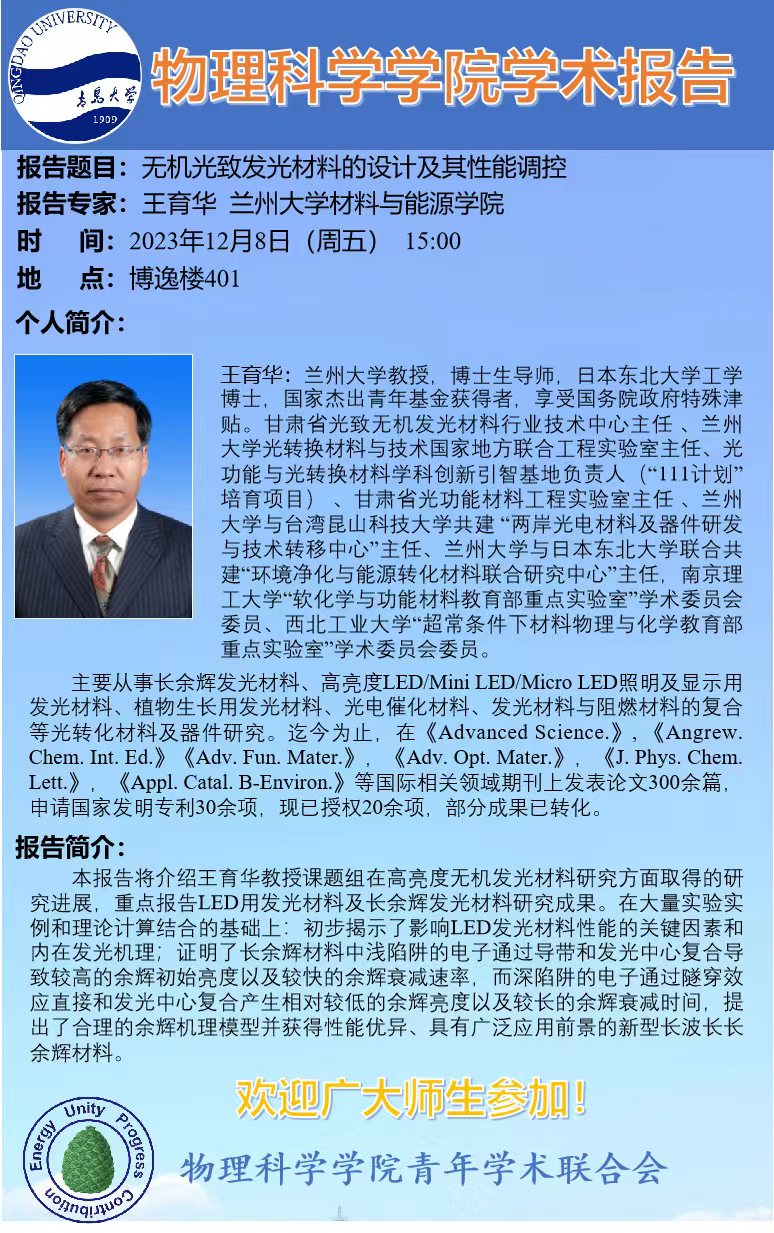 [学术预告]王育华-无机光致发光材料的设计及其性能调控