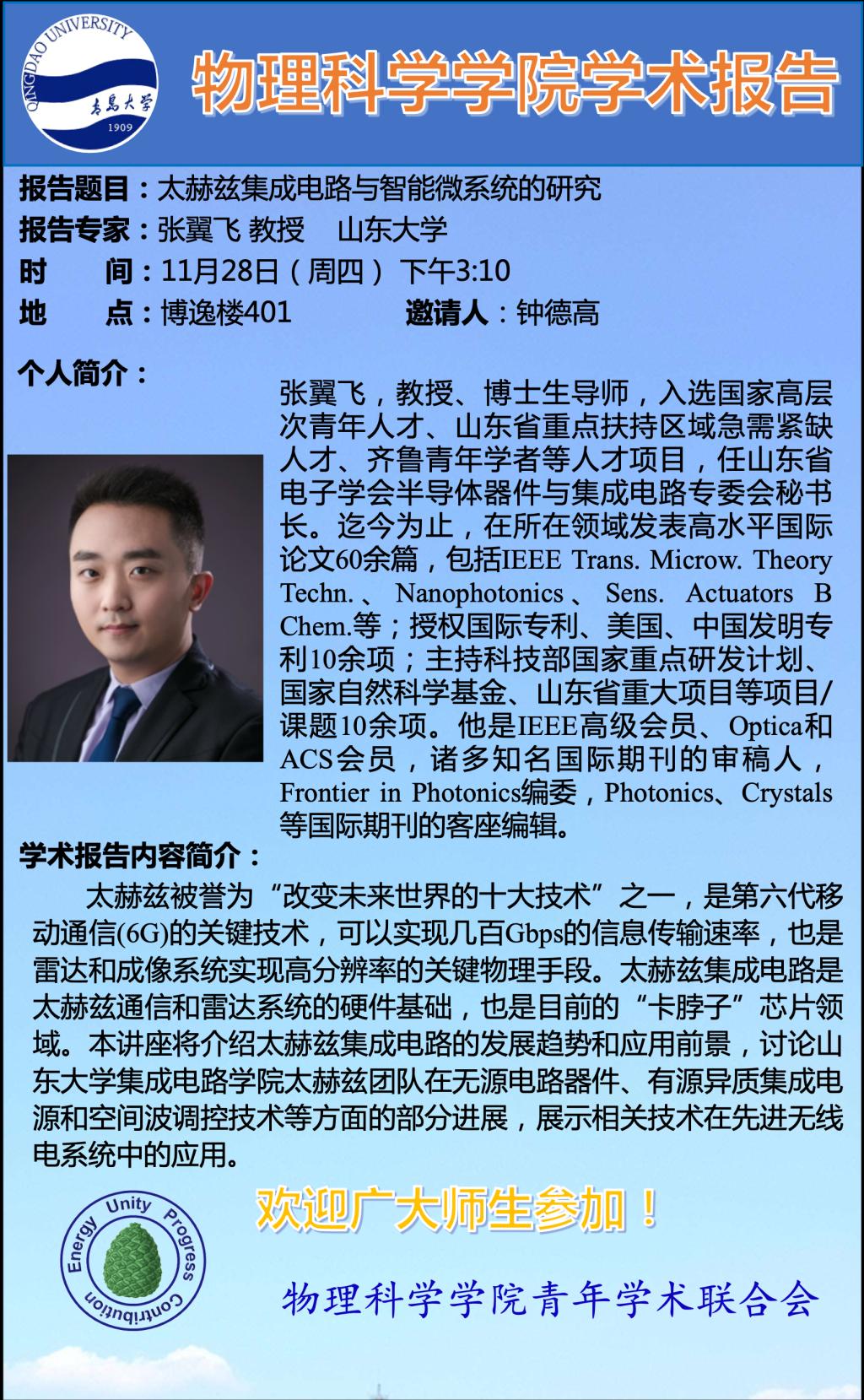 [学术预告]张翼飞-太赫兹集成电路与智能微系统的研究