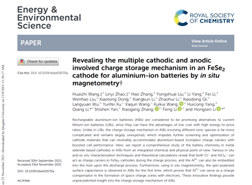 近日,国际顶级期刊《Energy & Environmental Science》在线刊登了我校题为“Revealing the multiple cathodic and anodic involved charge storage mechanism in an FeSe2 cathode for aluminium-ion batteries by in situ magnetometry”的原创性研究论文。《Energy & Environmental Science》是由RSC(Royal Society of Chemistry,英国皇家化学学会)出版发行的全球著名期刊,是国际能源、化学、物理及生物科学等交叉学科领域最具影响力的期刊之一,2021年最新影响因子为38.532。该论文第一作者为tyc5997太阳集团硕士研究生王怀志、赵林一(导师为李洪森教授)。通讯作者为tyc5997太阳集团李洪森、李强教授,tyc5997太阳集团为该论文的第一署名单位和通讯单位。该工作得到了tyc5997太阳集团大学生创新创业训练计划项目的资助,本科生朱世凯、东晓彤等同学荣获“建行杯”第七届山东省“互联网+”大学生创新创业大赛银奖。