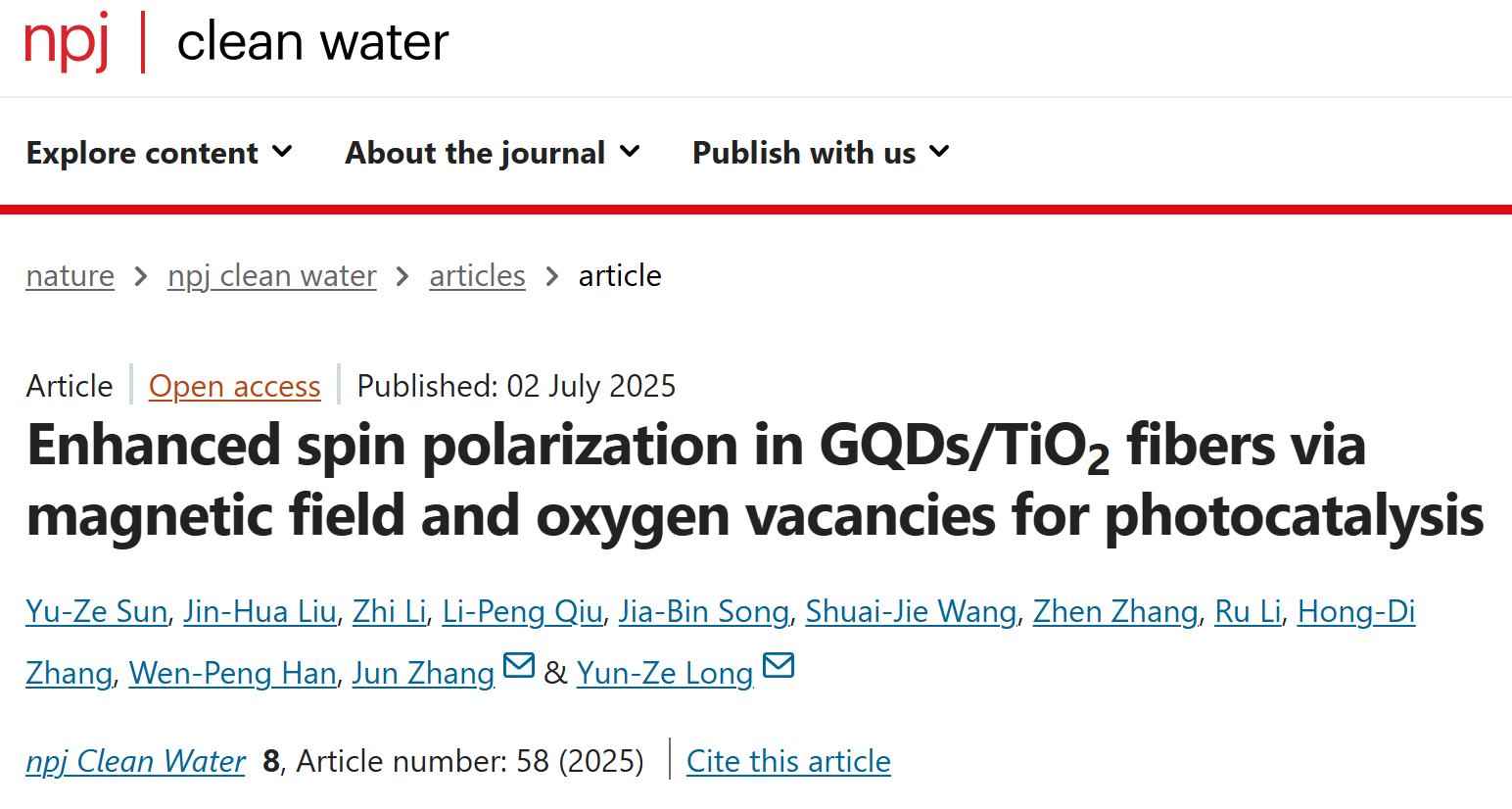 近日,我院龙云泽/张俊课题组在《Nature》旗下刊物《npj Clean Water》(2025,8:58)上发表了题为《Enhanced spin polarization in GQDs/TiO2 fibers via magnetic field and oxygen vacancies for photocatalysis》(通过磁场和氧空位增强石墨烯量子点/二氧化钛纤维中的自旋极化用于光催化)的研究论文。论文第一作者是硕士研究生孙玉泽和博士研究生刘进华,通讯作者是张俊副教授和龙云泽教授。《npj Clean Water》的SCI影响因子为11.4,2024年发文量仅130篇。