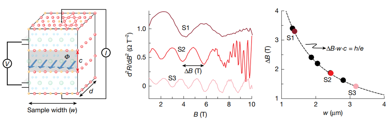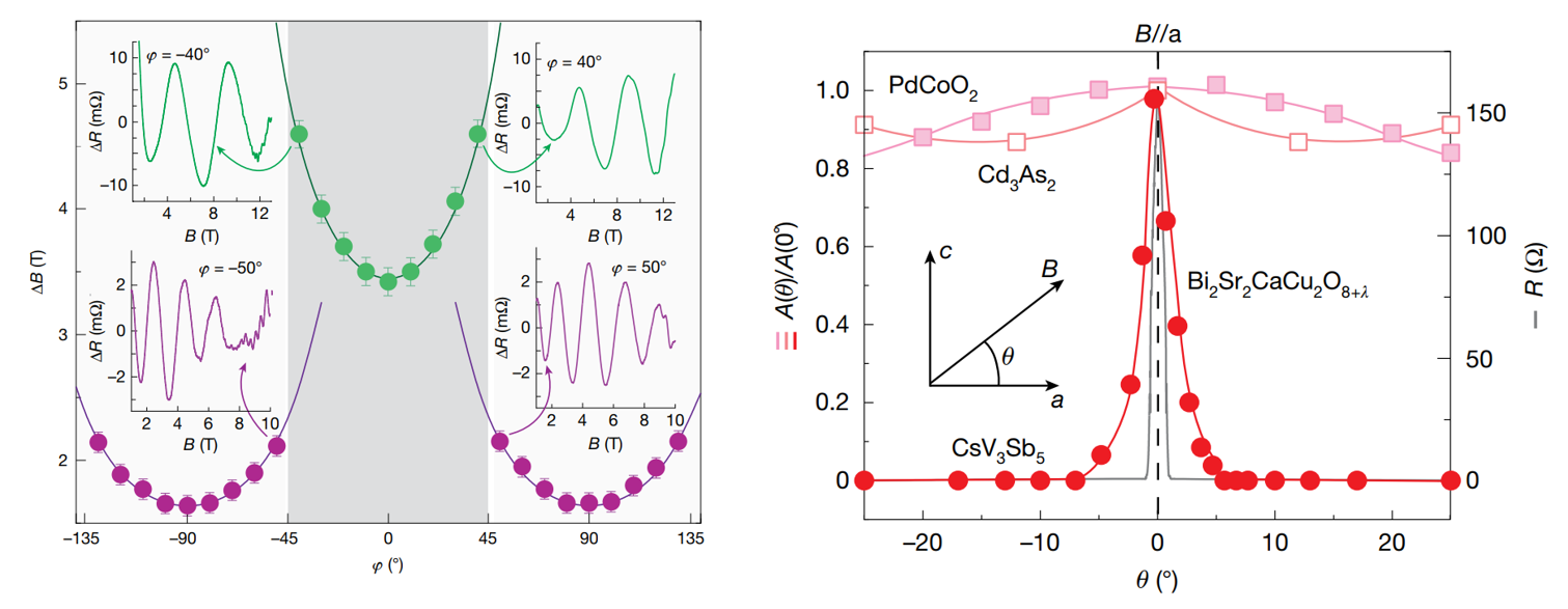 本工作在CsV3Sb5的层间电输运信号中发现了30 K以下正比于磁场且周期为h/e的磁电阻振荡。其对磁场的角度依赖关系以及较短的平均自由程均与同样表现出h/e振荡的高电导率金属PdCoO2不同,表明单粒子图像难以解释这一现象。该发现指向了一种宏观相干的集体电子态,其相干特性类似于超导电性,但缺乏无耗散凝聚。