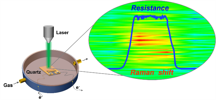 随着物联网和便携式电子设备的飞速发展,对低功耗室温气体传感器的需求日益迫切。然而,传统室温传感器普遍面临灵敏度低、响应恢复慢等挑战,其核心原因在于传感过程中材料表面缺陷、气体分子与环境间的复杂相互作用机制尚不明确。该工作创新性地利用可见光照射调控氧化铟(In2O₃)材料表面的氧空位浓度,并通过一系列先进的原位光谱技术(如原位Raman、DRIFTS),在原子/分子层面实时观测了传感过程中氧空位的动态生成与演化过程。研究发现,光照下产生的“光激发氧空位”,而非传统认为的光生电子-空穴对,是主导室温NO₂传感性能提升的关键因素。这些氧空位作为活性中心,不仅能增强NO₂的化学吸附,还能通过调控表面电荷转移显著降低反应能垒,从而使传感器在室温下对低浓度NO₂表现出超高灵敏度、超快响应/恢复速度以及优异的长期稳定性和选择性。该研究不仅揭示了光激发下氧空位动态演化对提升传感器性能的关键作用,同时阐明了光-缺陷-气体三者相互作用的微观机制,建立起一套缺陷介导的表面反应通用研究框架。这为面向环境监测、智能家居、可穿戴设备等领域的高性能、低能耗光电气体传感器,指明了材料设计与性能优化的方向。此外,该研究成果也对催化、电子器件等多个前沿领域具有重要的借鉴意义。