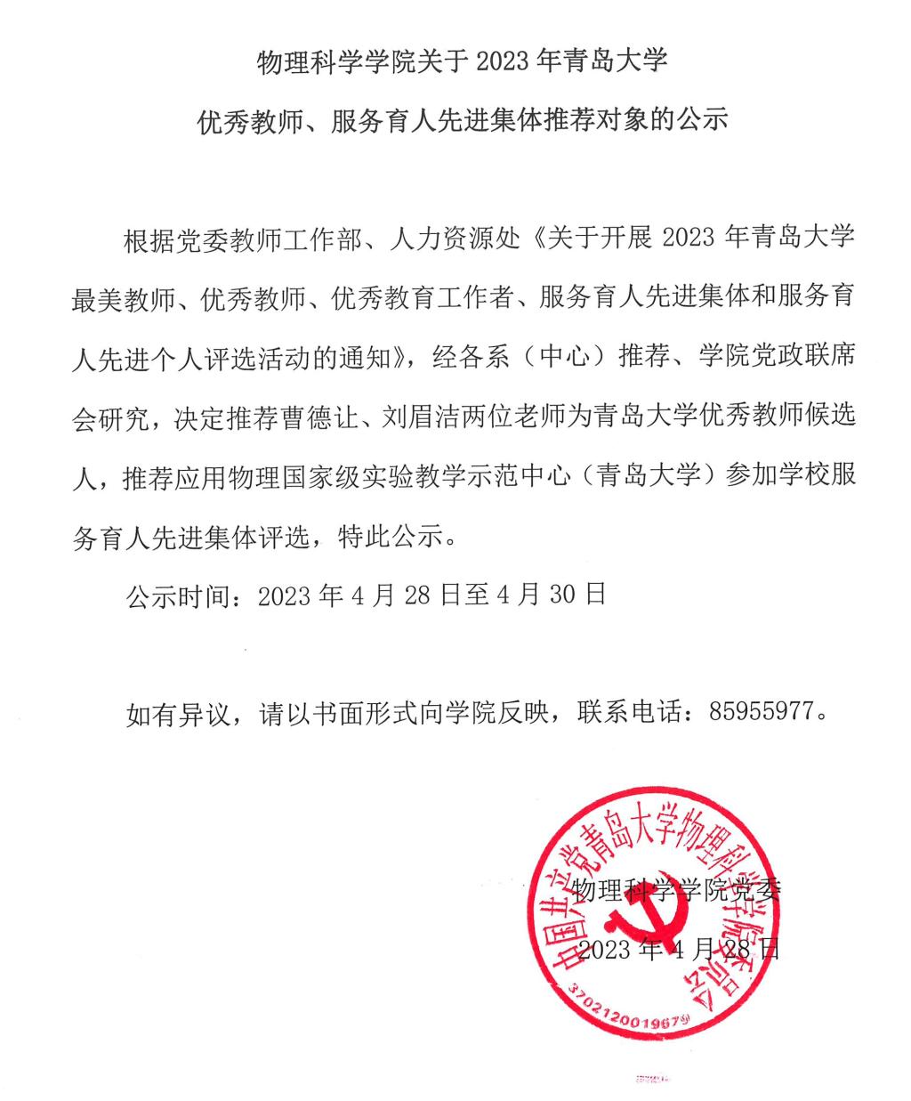 2023年优秀教师、服务育人先进集体推荐对象公示