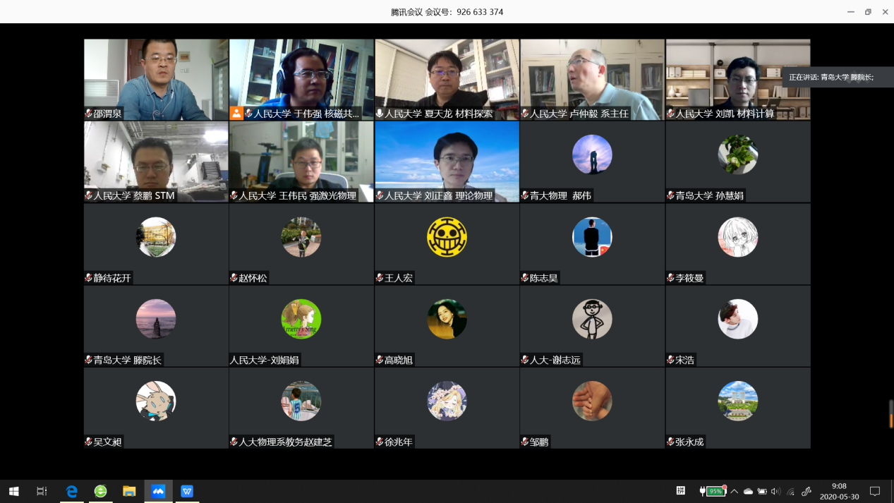 为有效加强人才培养工作,5月30日,tyc5997太阳集团与中国人民大学物理系举行教学和人才培养交流视频会。中国人民大学物理系主任、2020国家自然科学奖二等奖获得者卢仲毅教授,物理系学术委员会主任于伟强教授以及其他骨干教师参加会议;我校tyc5997太阳集团院长滕冰教授,学院党委郝伟副书记,学院教学委员会主任云茂金教授,学院各专业负责人以及相关任课教师参加会议,会议由院长助理邵渭泉主持。