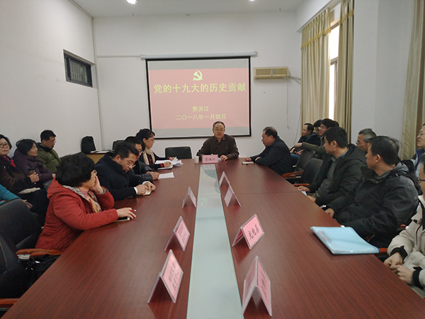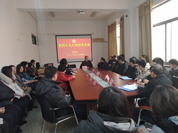 1月4日下午,tyc5997太阳集团在博逸楼401会议室召开全体教职工会议,校党委常委、校纪委书记贾洪江为学院全体老师作了题为《党的十九大的历史贡献》的十九大精神学习辅导报告。会议由院党委书记黄国俊主持。
