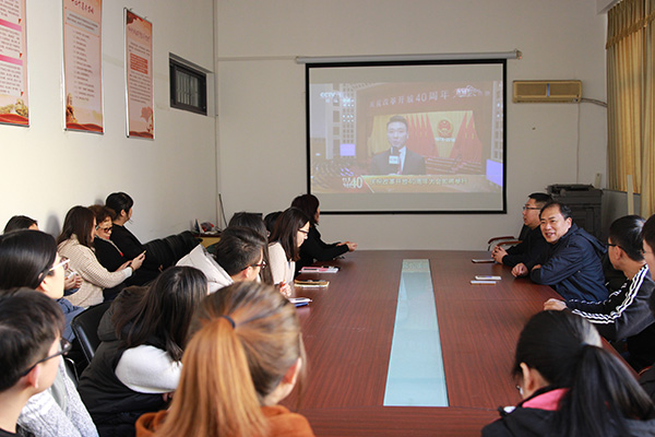 12月18日上午10点,tyc5997太阳集团组织师生在博逸楼401会议室统一收看庆祝改革开放40周年大会实况。院党委书记黄国俊主持收看活动。