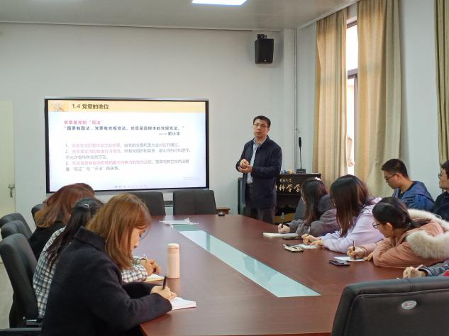 11月20日下午,tyc5997太阳集团入党积极分子秋季党课培训班第二课在博逸楼401会议室开课 。院党委书记李升学为入党积极分子主讲了题为《中国共产党章程》的党课。2018、2019级入党积极分子参加学习。