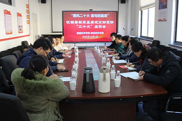 12月1日下午,刘彩云副校长来我院新能源科学与工程系党支部宣讲党的二十大精神,并以“乘风二十大 谱写新篇章”为主题与支部教师党员座谈,学院党委书记郝伟、党委副书记董永红及支部全体教师党员参加会议。