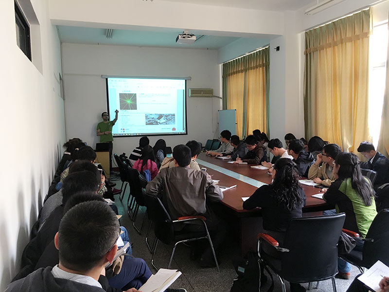 会上,Mostafa首先就激光历史背景、光的性能、麦克斯韦方程组及几何光学等内容详细介绍了激光物理基础知识,阐述了在一定介质中电磁场的变化,并综合以上知识介绍了几种不同类型的激光器。报告结束后,他就同学们提出的光纤通信的基本原理、如何将科研做细以及如何做好科研等问题做了详细解答。
