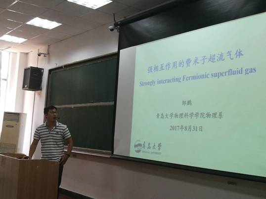 8月31日上午,我院特聘教授邹鹏应邀于博远楼103教室为学生作了题为《强相互作用的费米超流子体》的学术报告。这是我院夏季学期高端学术报告的第九场,本场报告会由袁峰主任主持,来自全校的280余名师生聆听了报告。