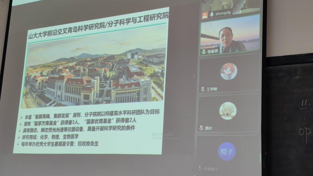在报告中,李春霞教授从现有癌症治疗方法的局限性和研究背景出发,介绍了如何将稀土上转换发光纳米材料与光动力、光热、化学动力学、饥饿法等治疗模式相结合,设计并合成多功能纳米肿瘤诊疗平台,重点介绍刺激-响应药物释放体系的构筑以及如何实现药物的可控释放和肿瘤高效协同治疗,从而克服传统化疗药物在肿瘤治疗中存在的问题。同时,还介绍了多功能纳米材料实现多模式生物成像等方面的新思路。报告会后,李春霞教授与参加报告会的老师和同学就纳米材料可控合成与结晶性进行了线上交流,并对山东大学前沿交叉科学青岛研究院的硕博招生政策进行了解读和答疑。