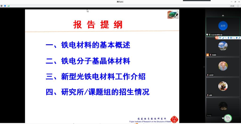 8月20日上午,中国科学院福建物质结构研究所博士生导师、国家优青孙志华研究员应邀为tyc5997太阳集团师生作了题为《新型光铁电体材料》的线上学术报告,并作了研究生招生宣讲。学院部分教师、研究生、本科生参加了报告会,报告会由应用物理系副主任钟德高主持。