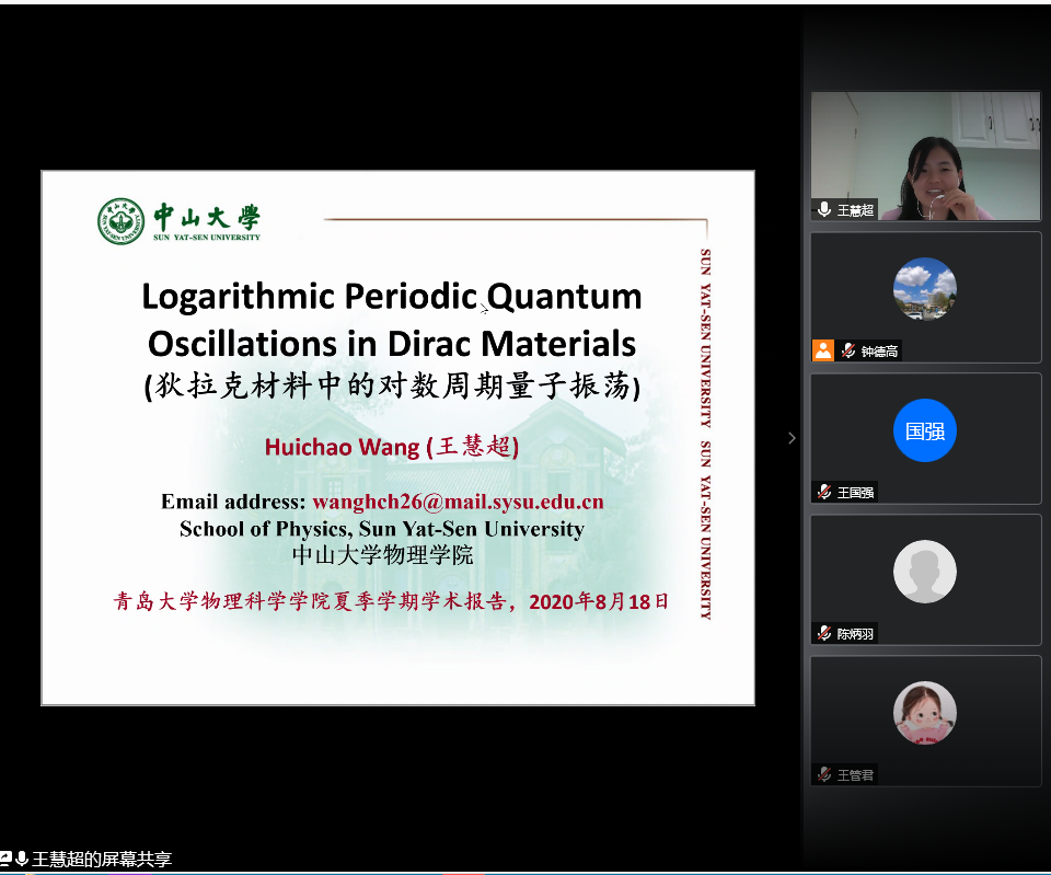 8月18日下午,中山大学物理学院王慧超副教授应邀为tyc5997太阳集团师生作了题为《狄拉克材料中的对数周期量子振荡》的线上学术报告,并介绍了中山大学物理学院的基本情况,作了研究生招生宣讲。报告会由tyc5997太阳集团应用物理系主任温峥主持,学院部分老师、本科生及研究生参加了报告会。