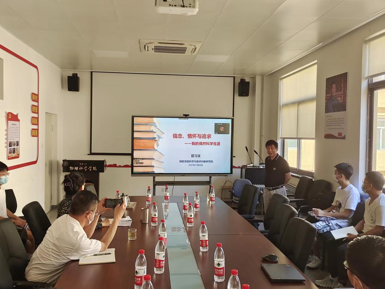 9月7日上午,武汉中科院精密测量科学与技术创新研究院管习文研究员受邀来我院访问,并以线上线下结合的方式为学院师生作了题为《信念、情怀与追求--我的偶然科学生涯》和《Observation of Spin-Charge separation in 1D atomic Fermi gases》的报告。报告由院长滕冰教授主持。院党委书记郝伟及李强教授、张永成副教授等老师和部分本科生和研究生聆听了报告。