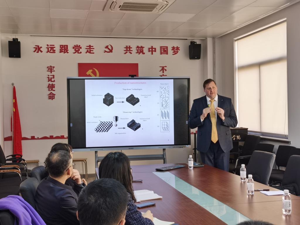Kozadaev Konstantin教授报告中介绍了通过在大气压条件下金属纳米颗粒渗透到源材料中,基于对强纳秒激光脉冲对金属靶的烧蚀过程的全面研究,以及对光学透明介质内和功能材料表面上的贵金属纳米颗粒阵列的快速诊断方法的开发,探索用于功能材料性能的体积和表面改性的新激光方法。参会老师们与Kozadaev Konstantin教授就于脉冲激光沉积技术制备金属纳米结构的关键科学问题和技术难点进行了深入探讨。