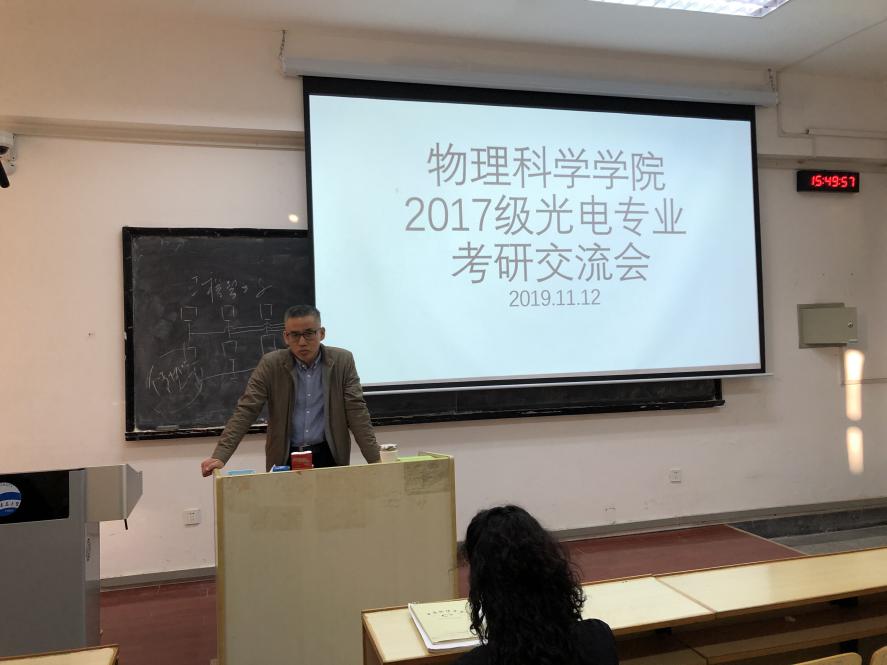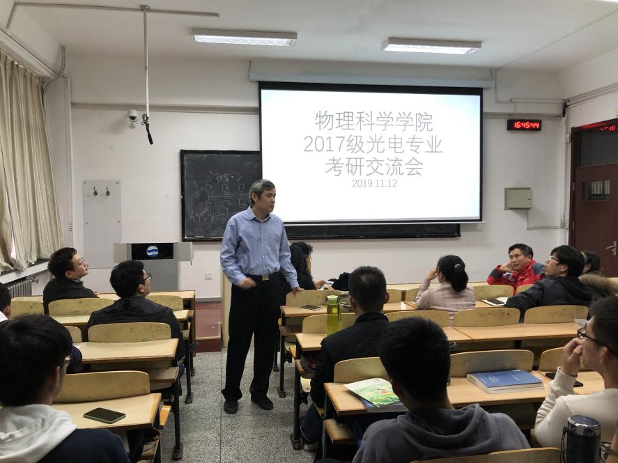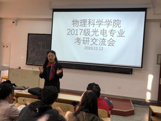 11月12日,我院2017级光电专业考研交流会在博学楼302教室举行。出席本次交流会的有:院长滕冰教授、党委副书记郝伟老师、光电信息科学与工程系主任云茂金教授、陈戍老师、刘兵老师、徐洪浩老师、马军艳老师、钟石磊老师等,以及2017级光电专业一、二班全体同学。本次交流会由滕冰主持。