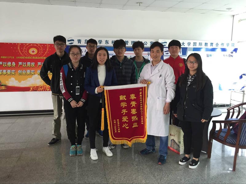 4月1日上午,青岛市中心血站工作人员携带一面写有“奉青春热血,献学子爱心”的锦旗来到tyc5997太阳集团,感谢物理学院2015级学子对无偿献血的支持。