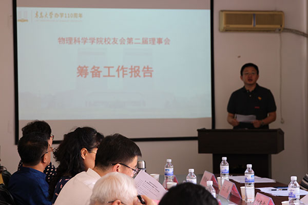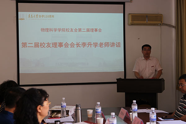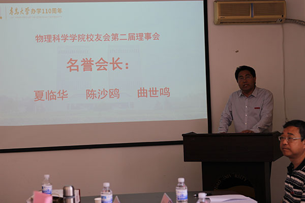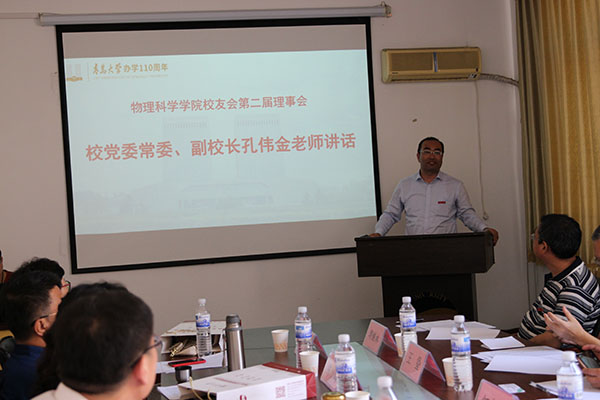 校党委常委、副校长孔伟金讲话,他首先向学院上一届校友会理事会各位理事所做出的贡献表示感谢,向新一届校友会理事会名誉会长、会长、副会长、秘书长、副秘书长以及各位常务理事、理事表示热烈的祝贺!接着,他谈了对校友工作的理解和看法,介绍了学校发展现状和取得的主要成绩,讲述了物理学科的发展沿革和历届青大物理人为物理学科发展所做出的贡献。他说,校友是母校的宝贵财富,是学校建设和发展的积极参与者和贡献者,校友的荣耀就是母校的荣誉,校友成就的高度代表着母校的高度,校友的名誉就是母校良好的声誉。今年适逢tyc5997太阳集团办学110周年,tyc5997太阳集团发展也站在新的起点上,希望大家奋发有为,一起共创更加美好的明天。最后,他祝各位校友生活美满,家庭幸福,事业进步,欢迎校友们常回母校看看,母校永远是校友们的家。