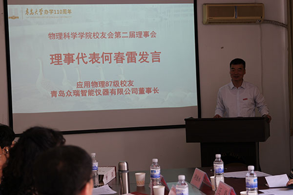 物理教育系84级校友、青岛市教育局初中物理教研员、校友会理事会副会长王㺸,应用物理87级校友、青岛众瑞智能仪器有限公司董事长、校友会理事会副会长何春雷分别发言,他们直言现在所取得的成绩得益于当年在母校所受到的教育,对母校的恩情永远都不能忘记,并表示将和母校一起共奋进,为母校和校友的发展做出更大贡献。