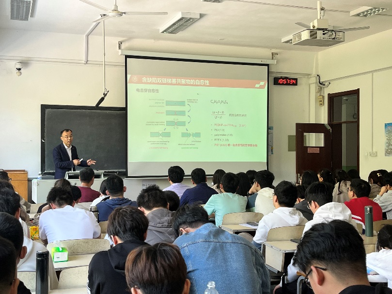 报告伊始,黄兴溢简要介绍了电容材料领域的发展现状,深入浅出地带领大家了解相关领域,随后对课题组最新发表的成果进行了简要介绍:“绝缘和导热的互为矛盾”是制约聚合物材料在先端电气电子装备发展的瓶颈问题之一。通过等规链段层状排列构建阵列化纳米区域,并在阵列化纳米区域中引入亲电陷阱基团,在大幅提升柔性聚合物电介质薄膜导热性能的基础上使电阻率提升了一个数量级,解决了导热和绝缘的矛盾。之后他介绍了课题组内各位成员的工作任务和贡献,强调了交叉学科中各种领域合作的重要性,鼓励同学们认真学习各门知识。报告结束后,黄兴溢与师生们进行了深入交流,针对每位师生提出的问题给予了详细解答,并展开了深度交流。