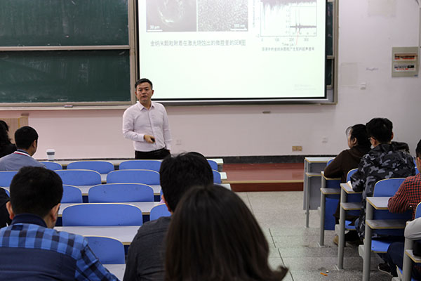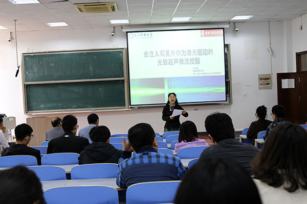 5月13日上午,我校校友、电子科技大学基础与前沿研究院院长王志明教授应邀在博远楼103教室为学生作了题为《金注入石英片作为激光驱动的光致超声微流控泵》的学术报告暨考研宣讲。报告会由院长滕冰主持。学院相关研究方向的师生和有志考研的学生参加了报告会。